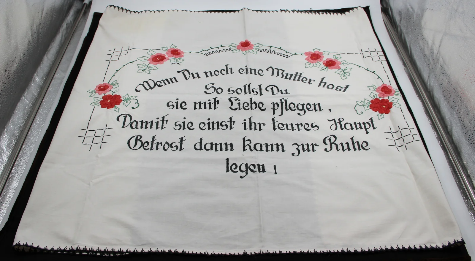 Description: With German text. The text is black, with a rose motif in the two upper corners filled with satin stitch. Made with tapestry yarn. The edges on all four sides are crocheted with black yarn, sewn to the fabric with large stitches.