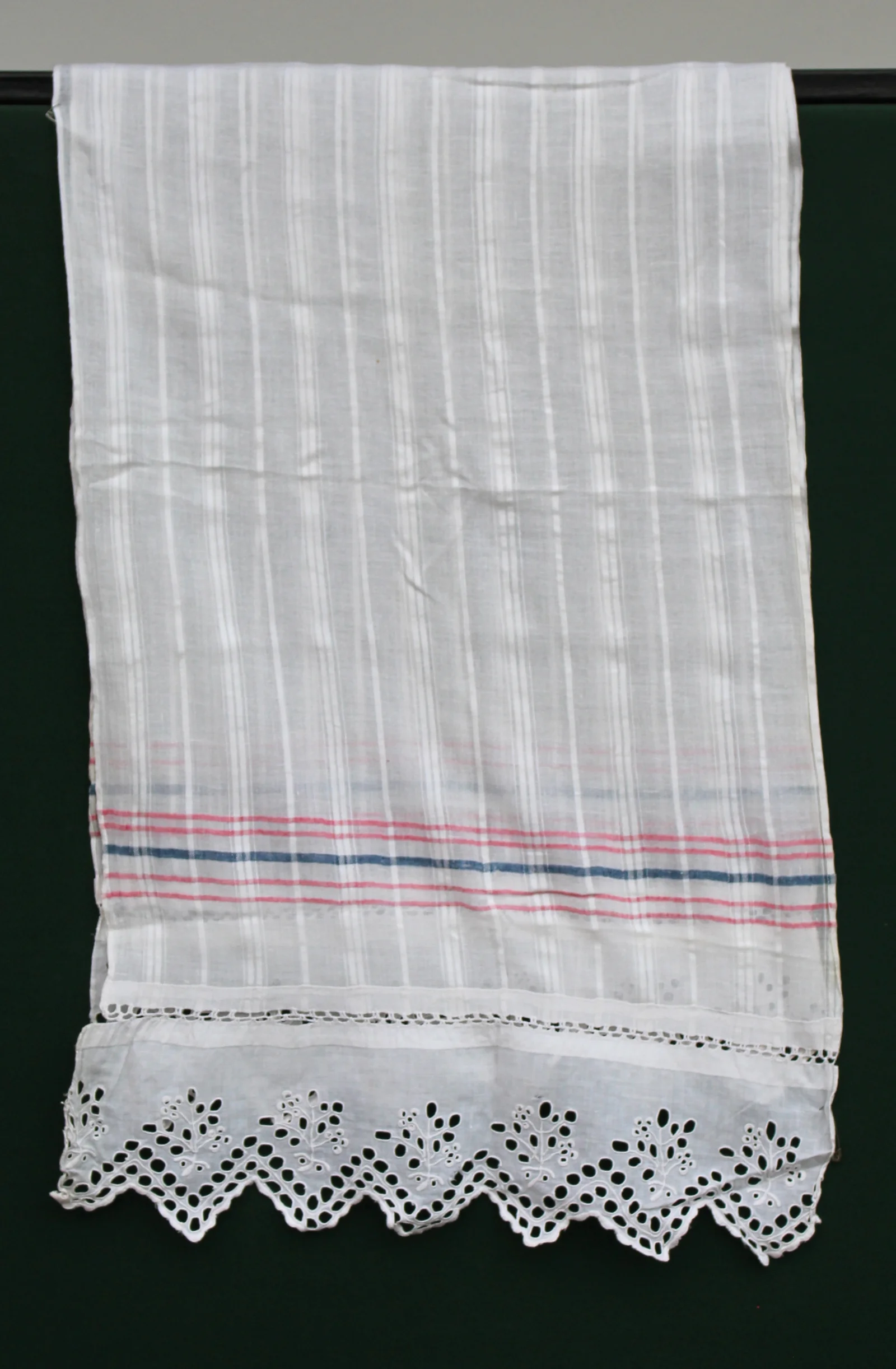 Description: White openwork embroidery at the bottom. Pink and blue stripes on the ruffled canvas. The ruffled canvas and chiffon parts are joined by chain crocheting. Used at weddings.