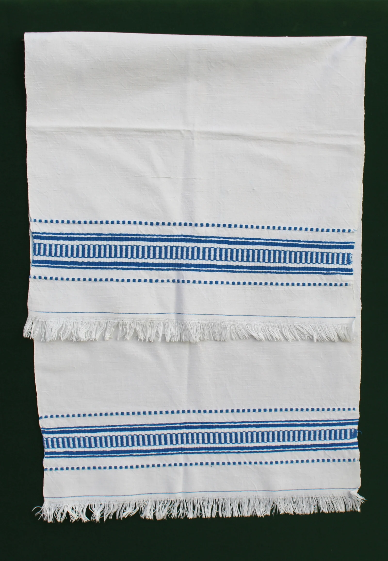 Description: With blue stripe rhythm. Fringed bottom.