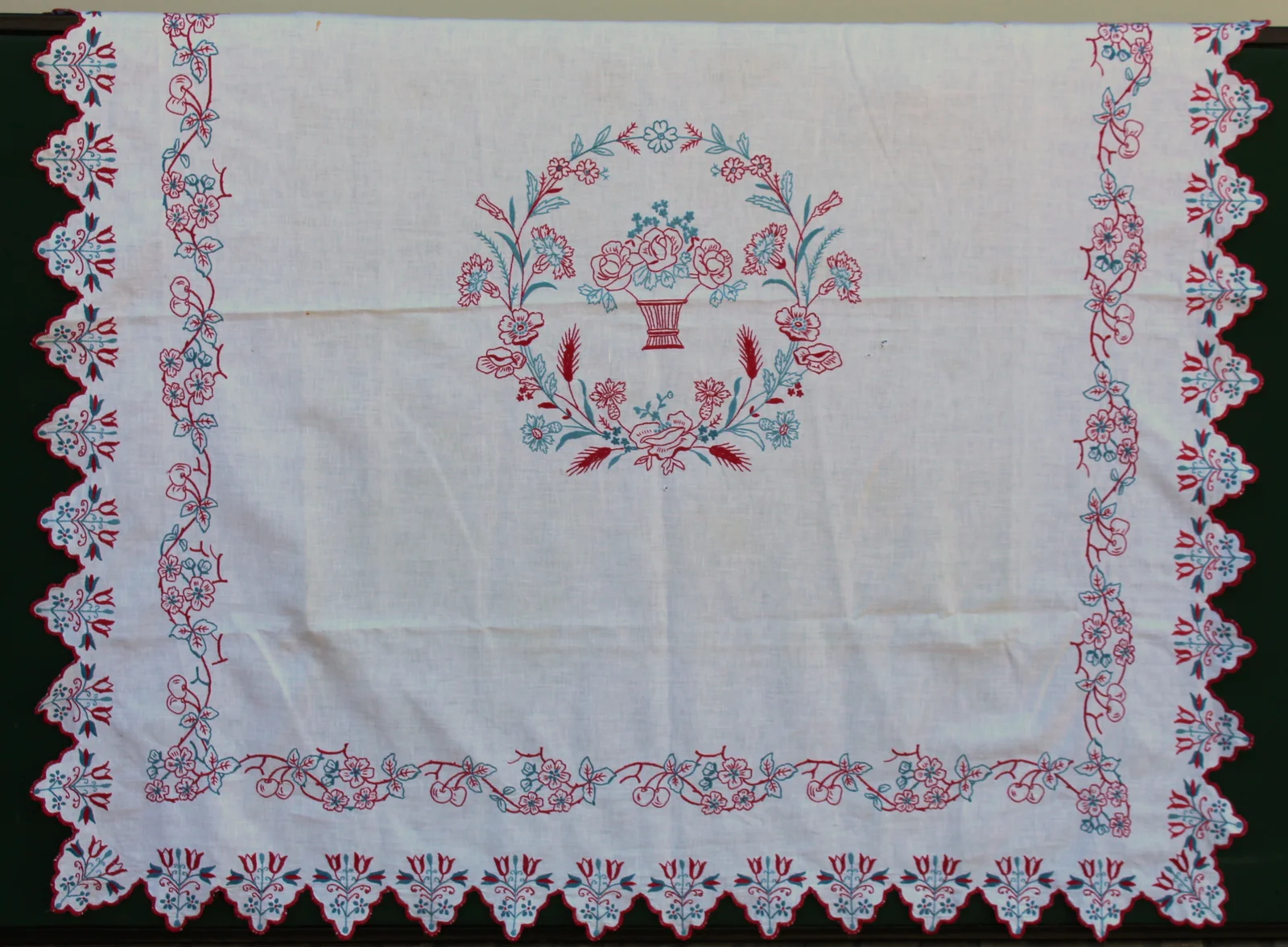 Description: Embroidered with red and blue embroidery thread using stem stitch and satin stitch. Motif: a flower basket in the center surrounded by a wreath of wildflowers. The continuous, naturalistic vine motif, decorated with cherry blossoms and cherries, conforms to the square shape of the tablecloth. The edge is sewn around with red thread, and small, stylized floral patterns are embroidered into the scallops. Torn in one place, slightly rusted in another.