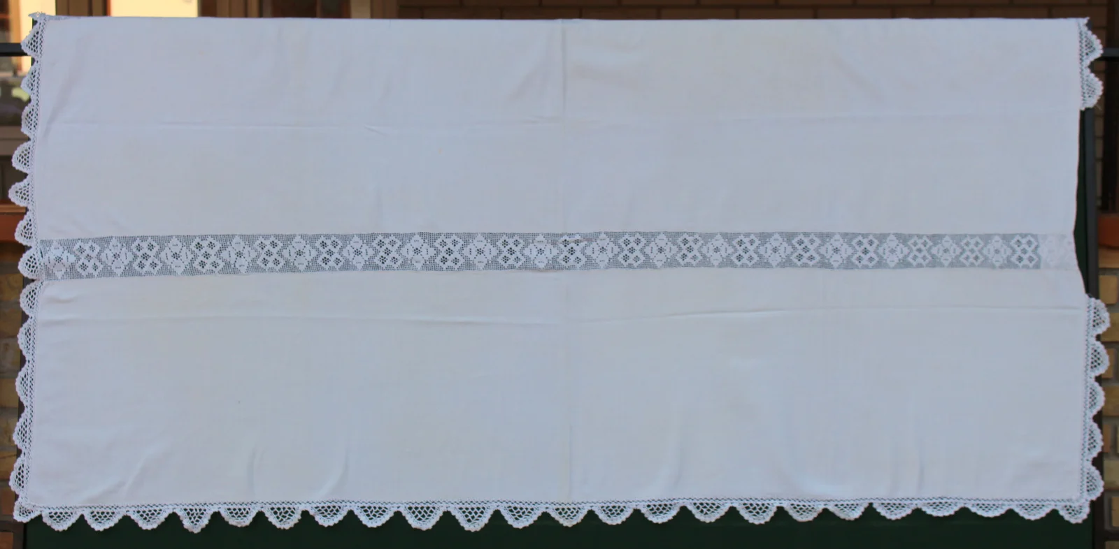 Description: Twill weave tablecloth, with two rows of "insert lace" and crocheted lace trim. The lace is not completely sewn around, approximately 20 cm is missing, torn in several places, and there are 2 visible stains on the tablecloth.