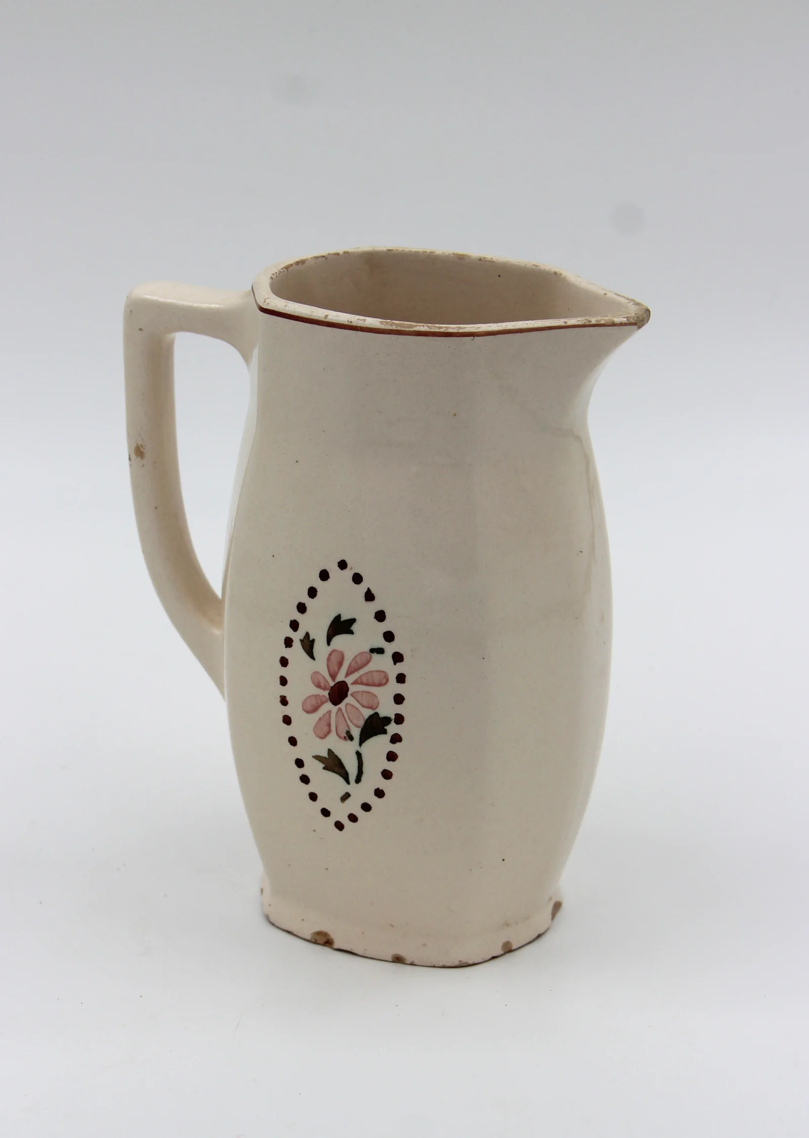 Description: Single-handled, spouted, white earthenware, with pink, decal floral decoration on both sides of the body, number 2731 on the base. One and a half liters.