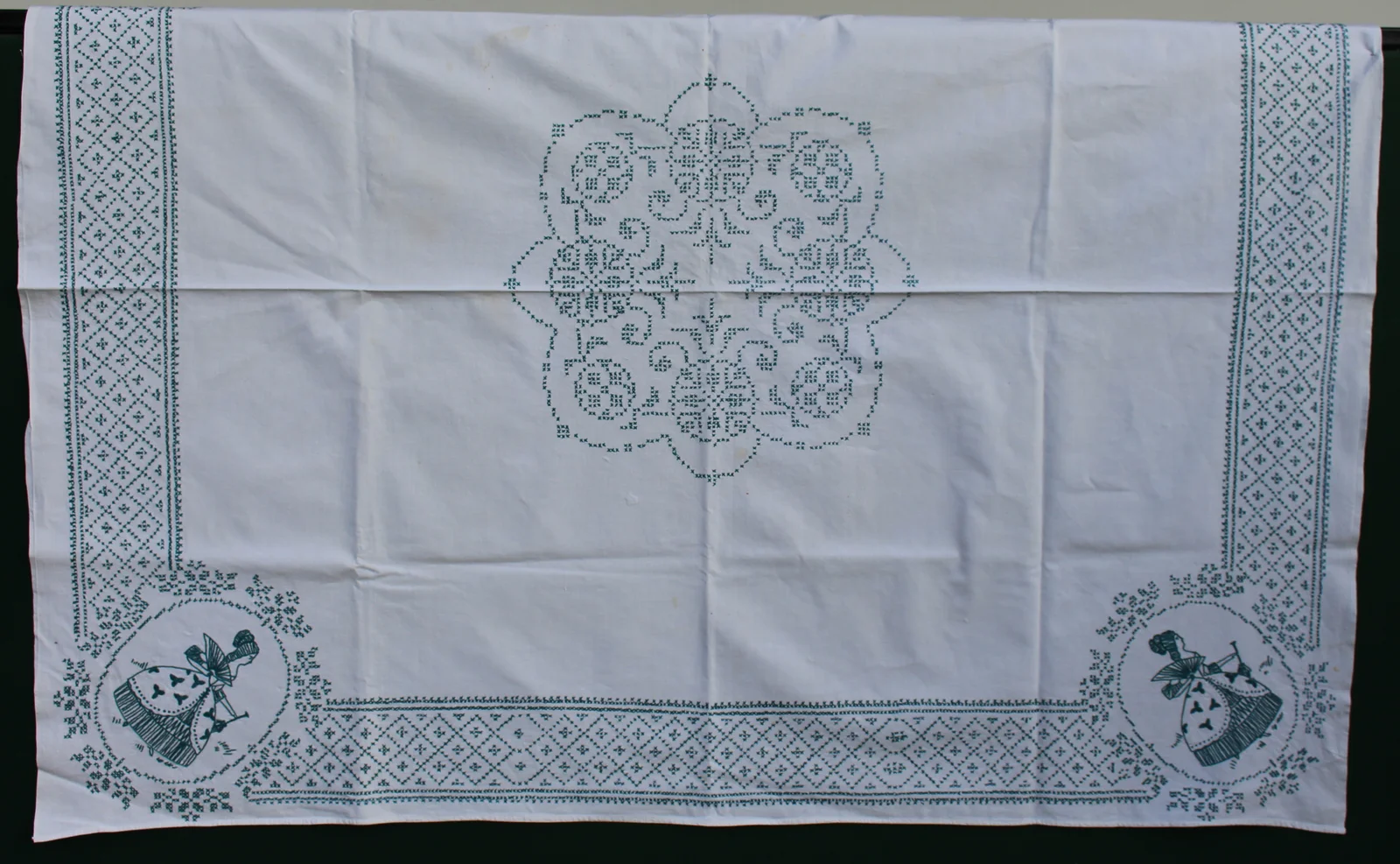 Leírás: Kékeszöld cérnával, száröltéses és keresztszemes (nem szálszámolásos) technikával kivarrva. Sarokmotívuma: rokokó jellegű, legyezős nőalak ovális keretben. Néhány helyen apró rozsdafolt.