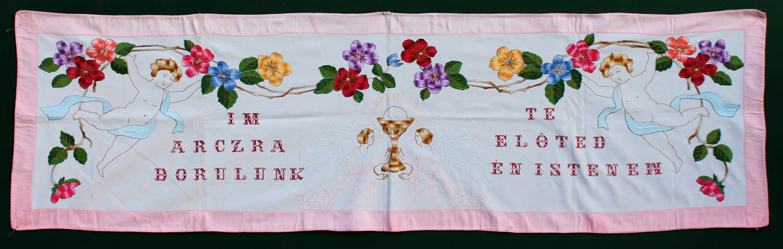 Leírás: Több színű hímzőszállal, száröltéssel, hamis laposöltéssel és keresztszemes öltéssel hímezve. Motavumai: virágfüzért tartó puttók, középen két angyal kelyhet és ostyát tart. Felirata: "Im arczra borulunk teelőted én Istenem" Kifakult piros anyaggal szegélyezve. Szobai falvédő.