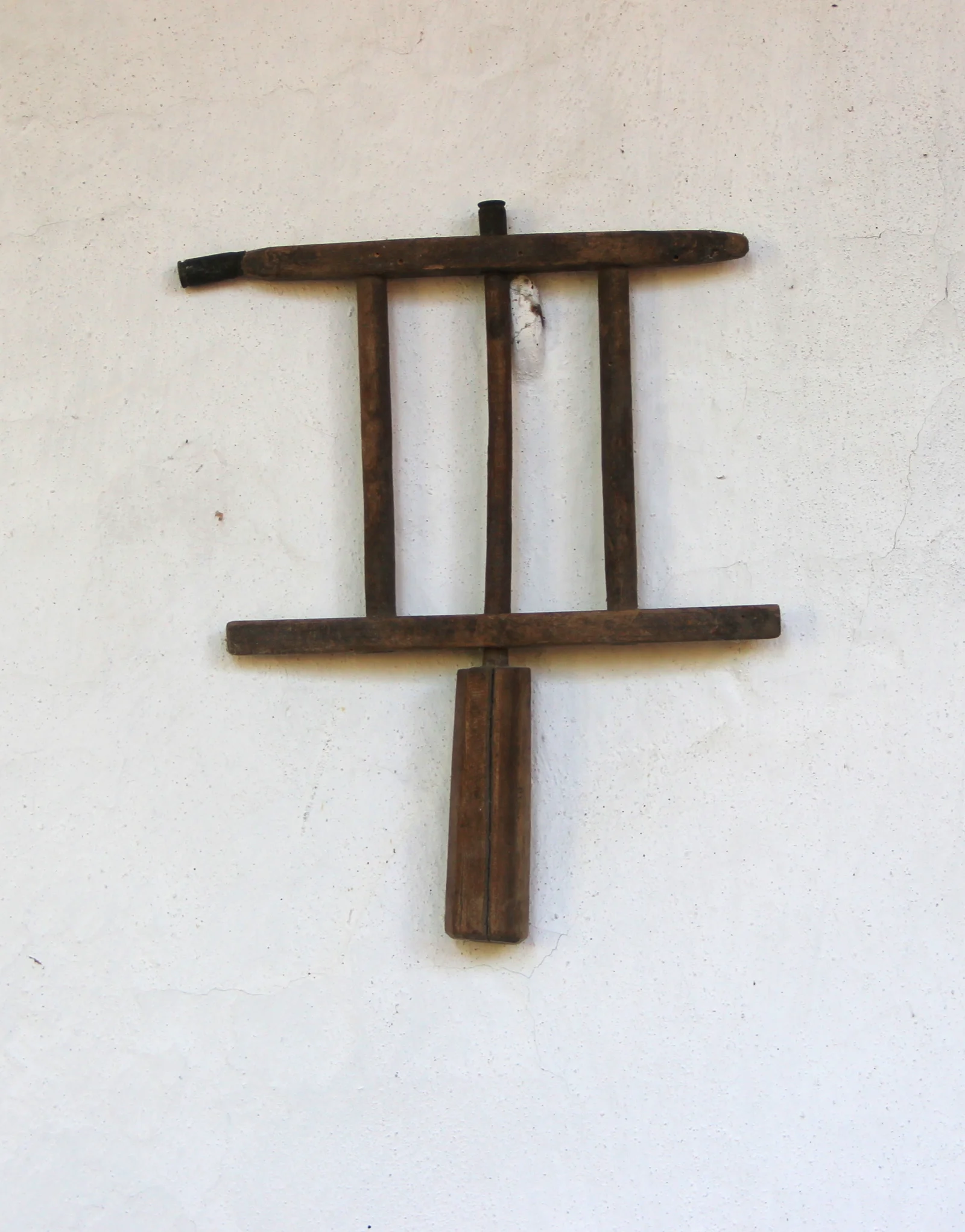 Leírás: Minden része fából van. Házi készítésű. Egyik "szarvát" és a nyél fölső végét (ahol forgott a kallantyú) töltényhüvely végével erősítették meg, hogy ne kopjon el.