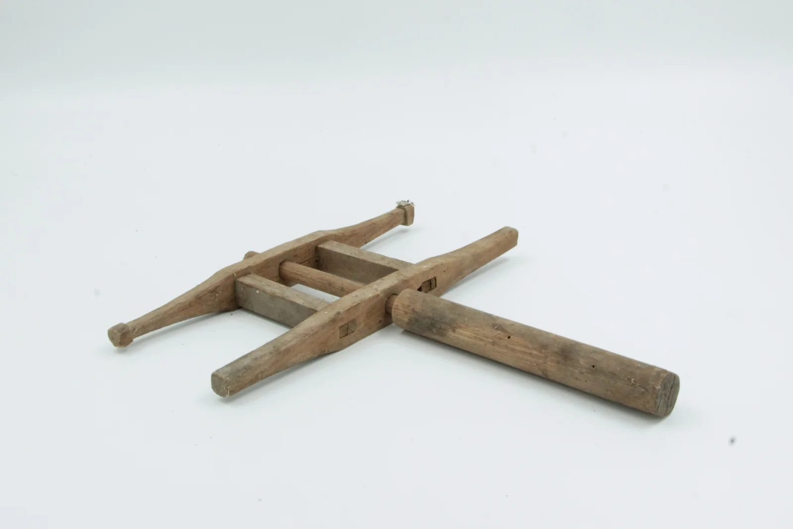 Leírás: Minden része fából van. Házi készítésű. Nyele hengeres. Hiányzik belőle a zárószög. A forgó rész felső karjának végén bevágások gátolják meg a cérna lecsúszását.