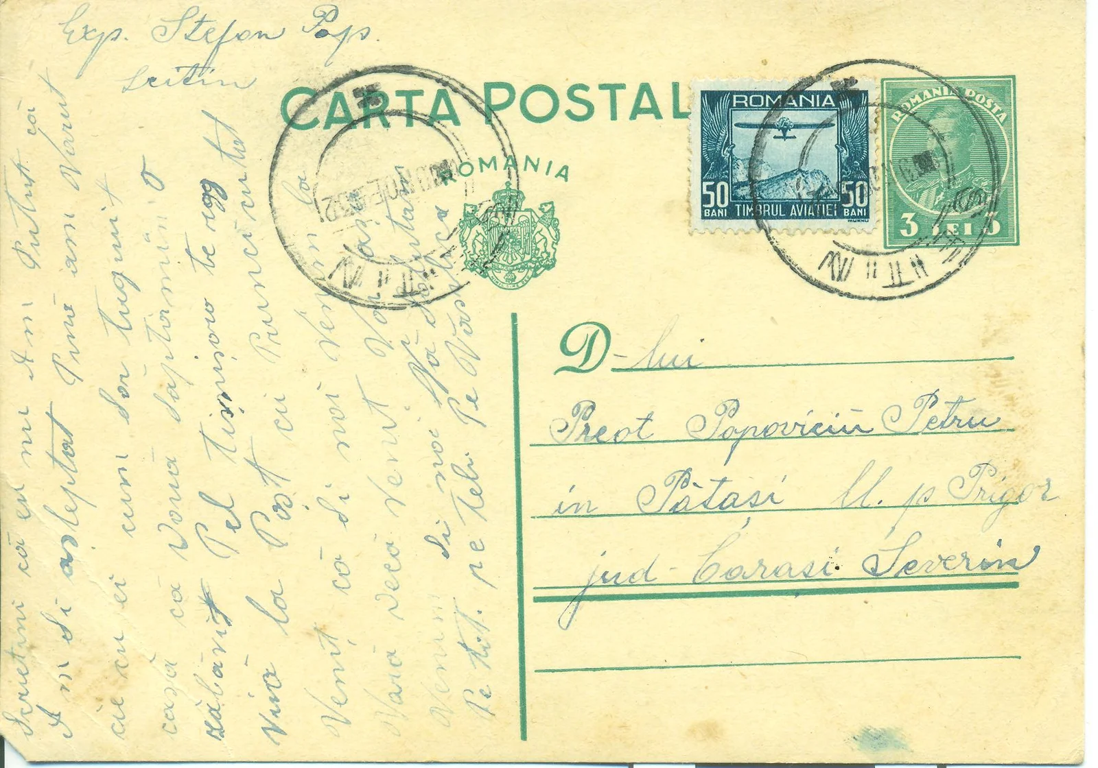 Postai levelezőlap Popovici Péter patasi (Krassó-Szörény) papnak címezve, Pop Ștefan Șeitin részéről. Mindkét oldalon kézzel írva, kék tintával. A levelezőlap szövege a feladó családi életével kapcsolatos híreket tartalmaz. Zöld tintával nyomtatva a „carta postala” szöveg, a címer és a Románia név. A levelezőlap 2 bélyeget tartalmaz, és 1923. november 5-i dátummal van lepecsételve.