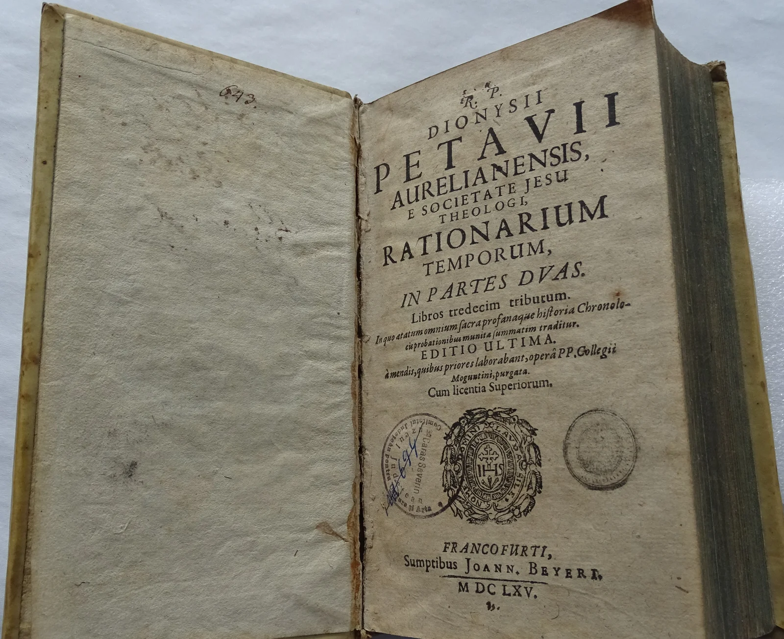 Old book with the title: ”D. Petavii Aurelianensis e Societate Jesu, theologi, Rationarium temporum” (A Chronology of Times, by D. Petavius Aurelianensis, Jesuit theologian) The volume is bound in glossy cardboard, printed with Latin alphabet, on watermarked paper. The title page states that the work was printed in Frankfurt, at the expense of Joann Beyer, in the year 1665 (Francofurti, Sumptibus Joann Beyeri, MDCLXV)