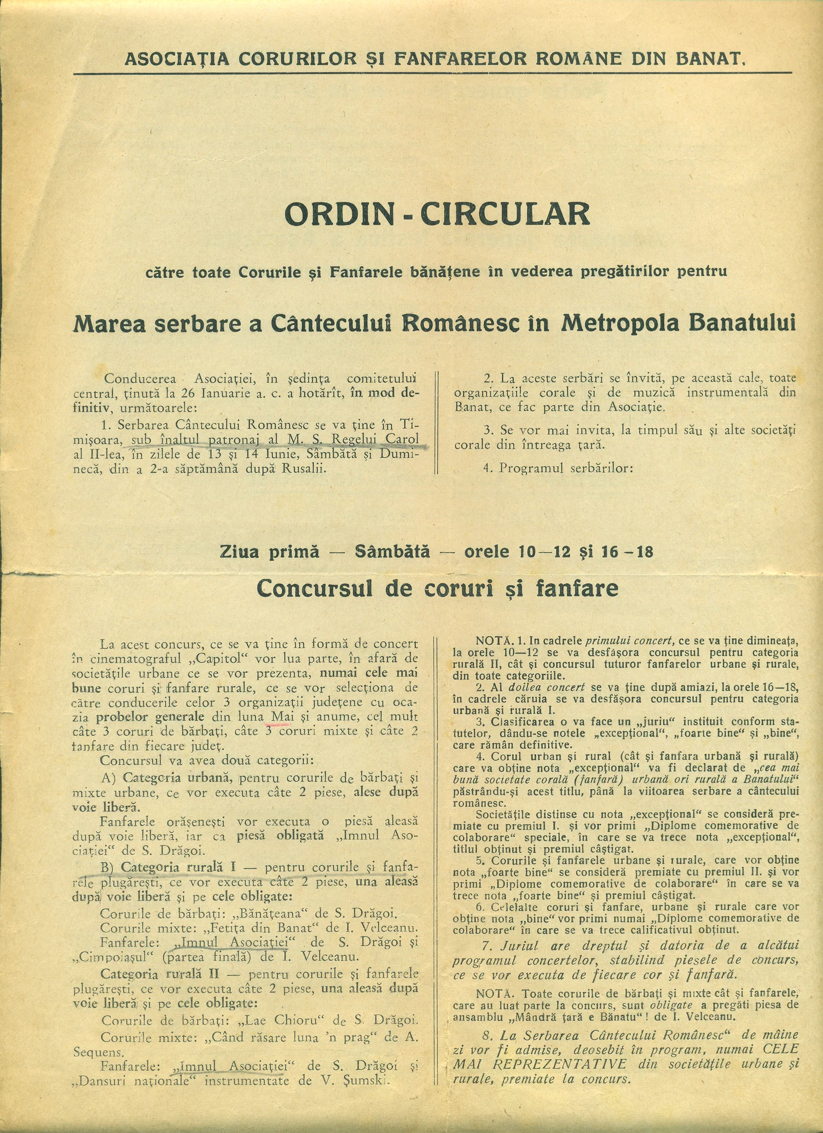 Order issued by the Association of Romanian Choirs and Brass Bands from Banat to all Banat choirs and brass bands regarding preparations for the "Great Celebration of Romanian Song" held in Timișoara, on June 13-14, 1936. The order was issued on January 23, 1936.