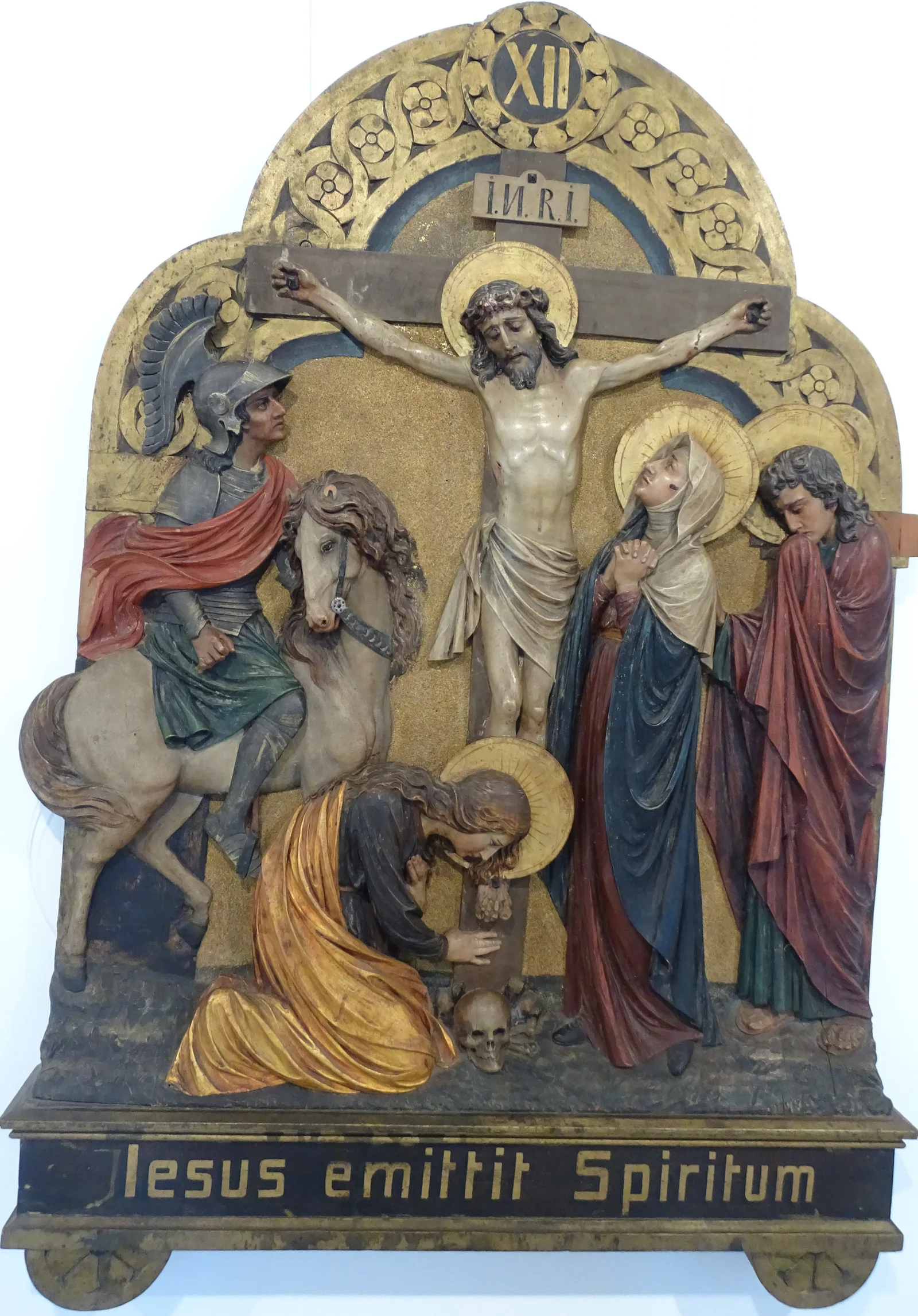 Polychrome wooden icon, depicting the cross on which Jesus was crucified. On the left side, a soldier on a white horse is depicted, and on the right side, Mary Magdalene and the Mother of God. At the bottom, the text "Iesus emittit spiritum" is engraved in Latin.