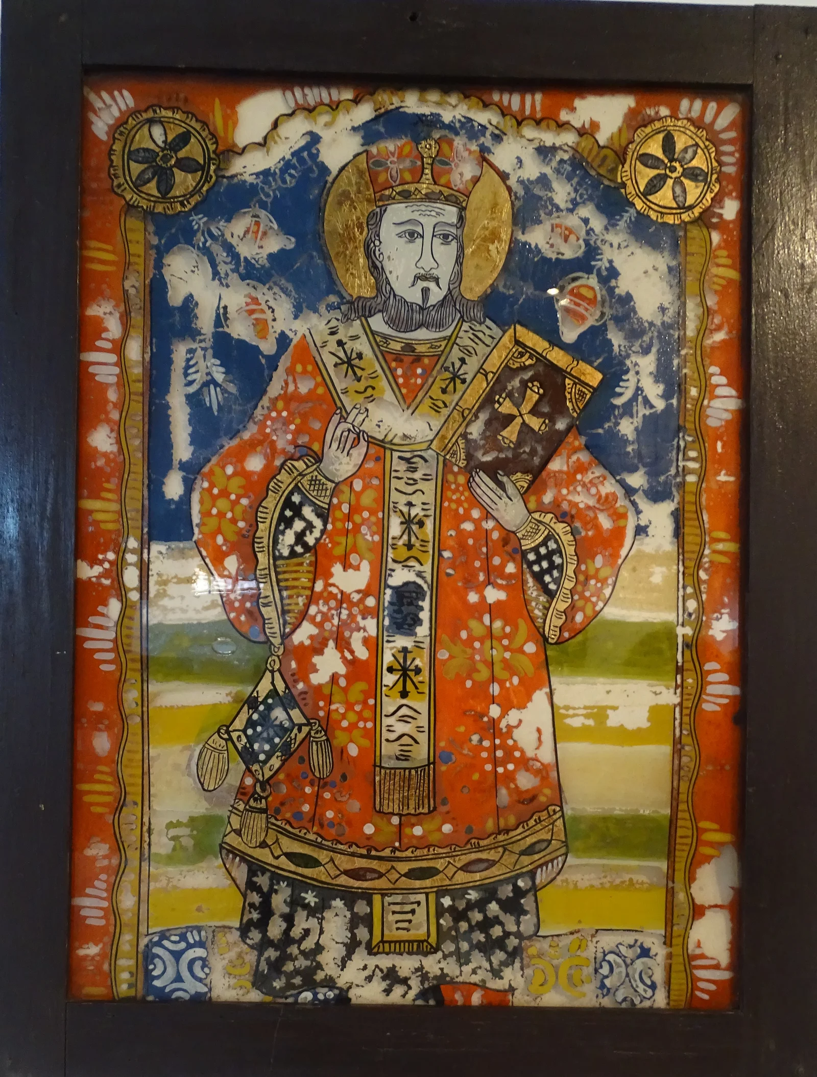 Icon on glass, painted in tempera. It depicts Saint Nicholas standing, blessing, with a bible in hand, crowned. At the top, it has an ornamental border, with golden rosettes on the corners, a background with horizontal blue stripes.
