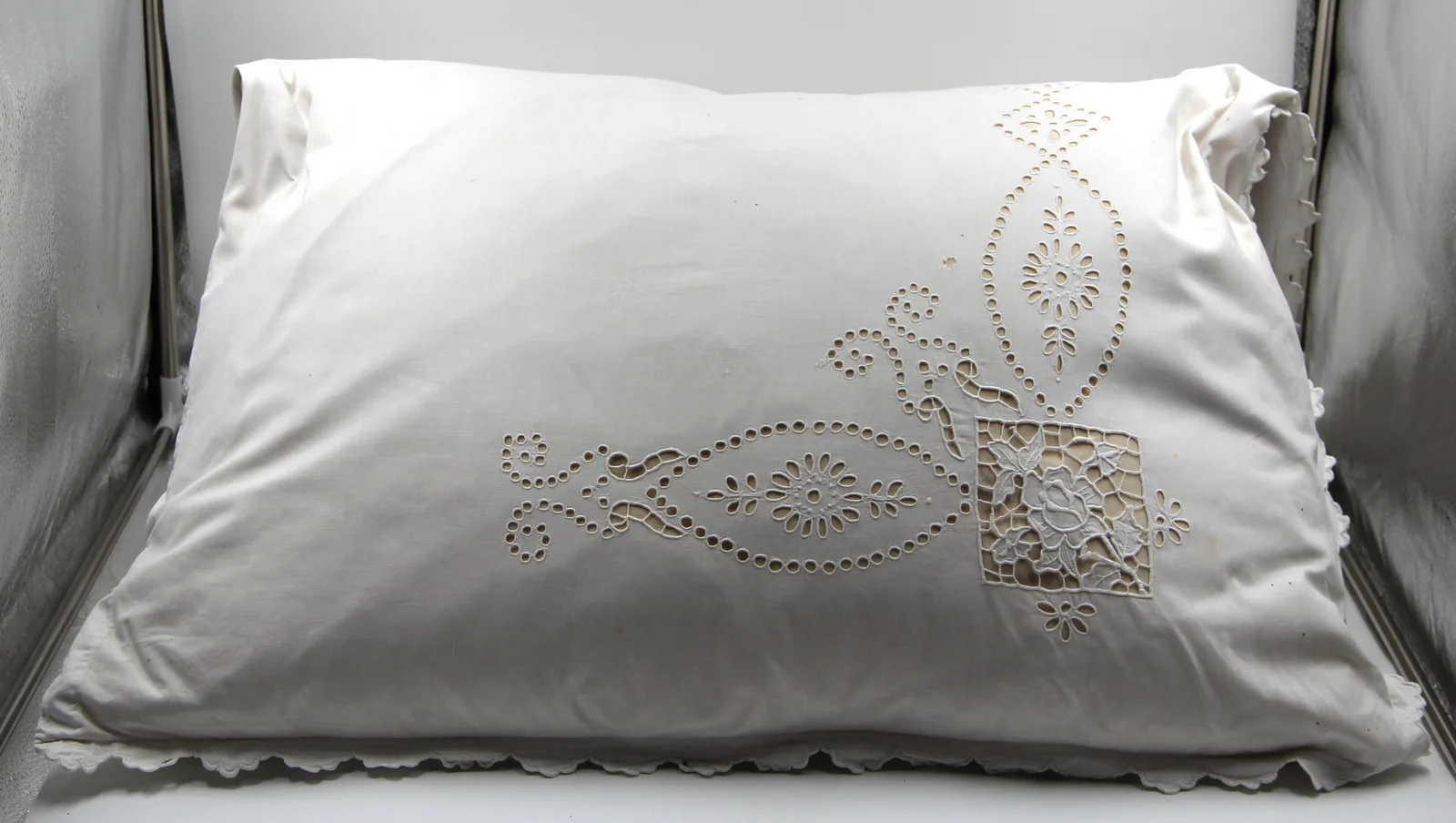 Descriere: Decorația este plasată pe fața pernei. Broderie albă cu găuri, în tehnicile Madeira și Richelieu, broderie manuală. În cele două colțuri, model de trandafir încadrat într-un pătrat.