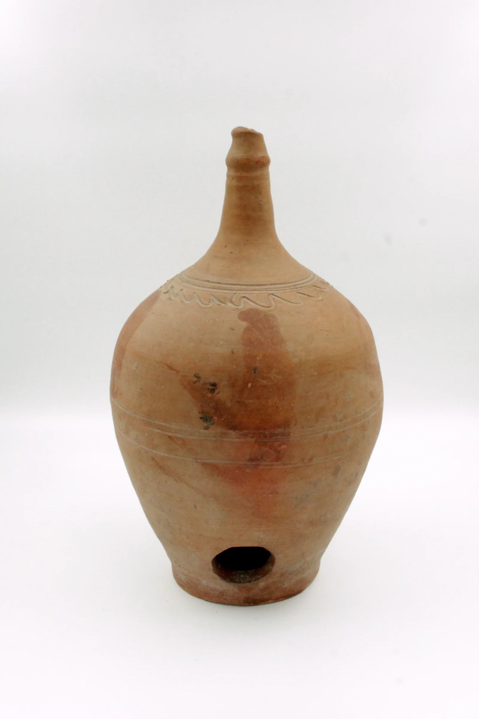 Descriere: Vas de lut neglazat. Decorarea s-a realizat prin zgâriere, pe roată - dungi și linii ondulate pe umăr. Gaura care servește drept mâner este rotundă, tăiată grosolan.