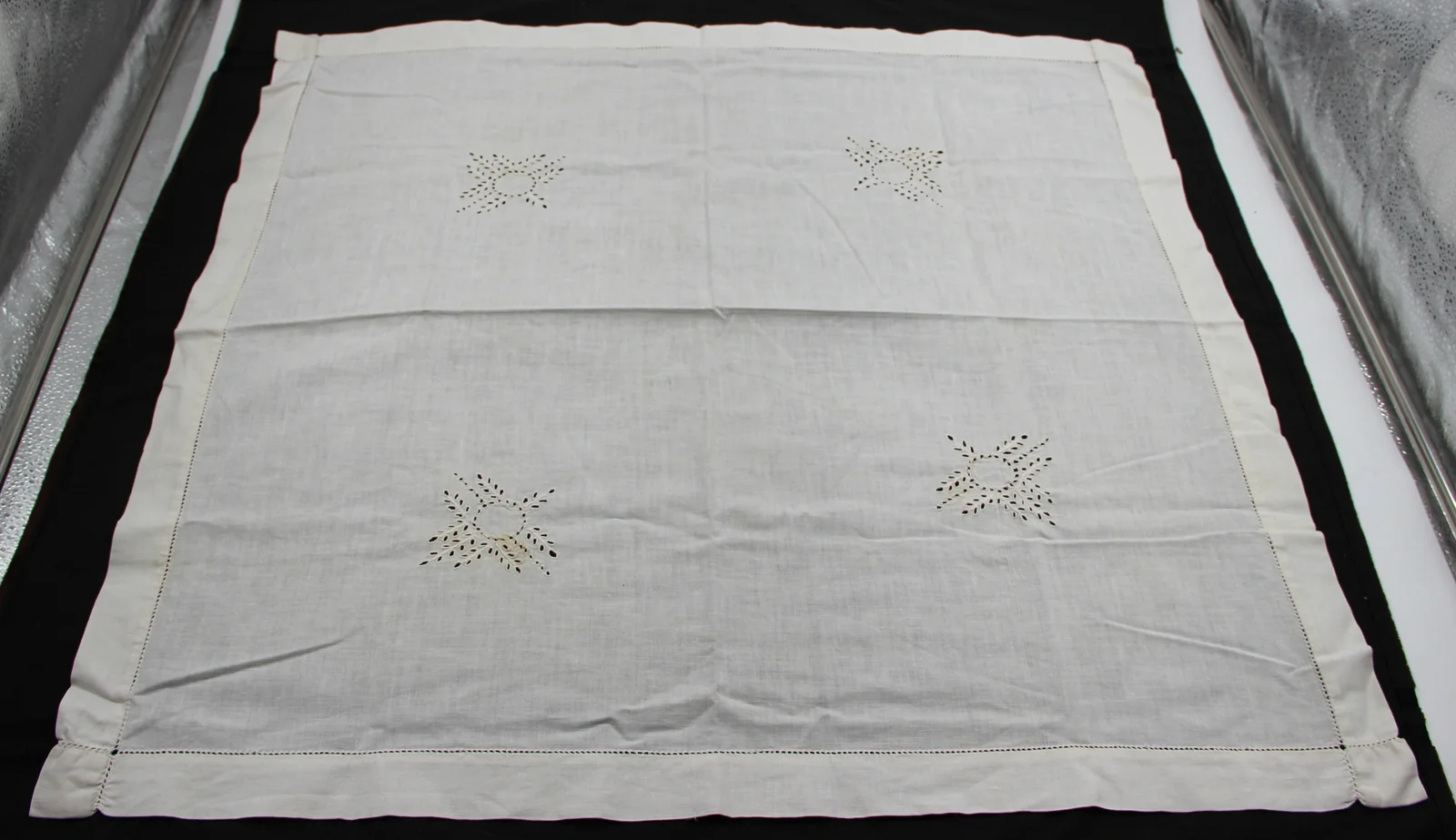 Opis: Beli vez sa rupicama. Sa jednostavnim porubom. U četiri ugla motivi listova koji polaze iz kružnog oblika.