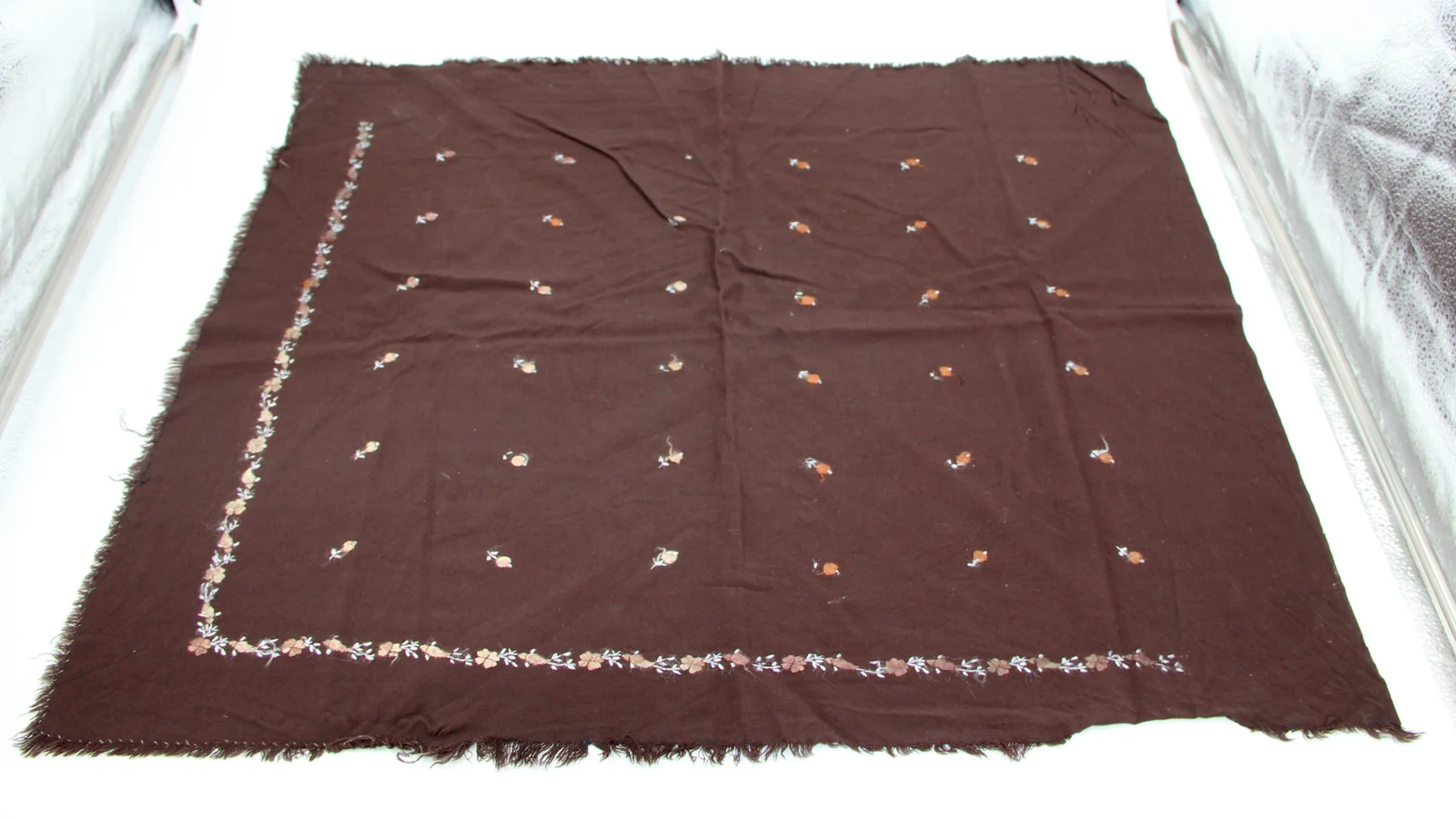 Opis: Tamnosmeđa marama. Vez je srebrnobele i boje breskve. Sa dve strane je izvezen venac cveća raspoređen u vidu trake, a u sredini su razbacani mali cvetni motivi izvezeni svilenim koncem.