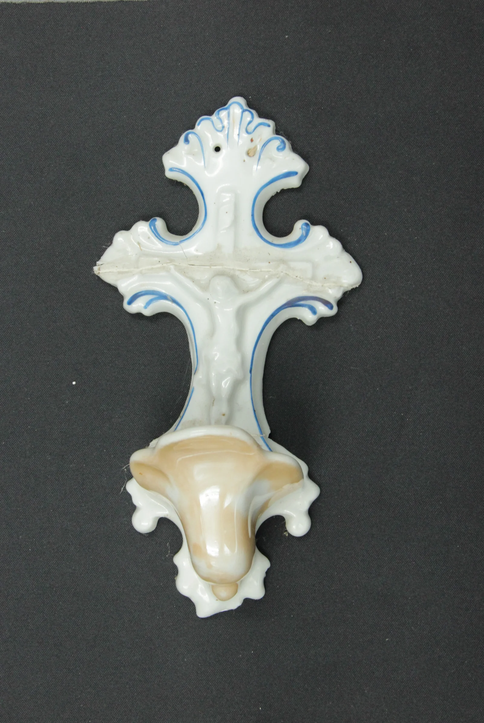 Opis: Beli porcelan. Ivice oblika krsta ukrašene su tamnoplavom trakom. Posuda za svetu vodicu je odozdo premazana glazurom boje kajsije.