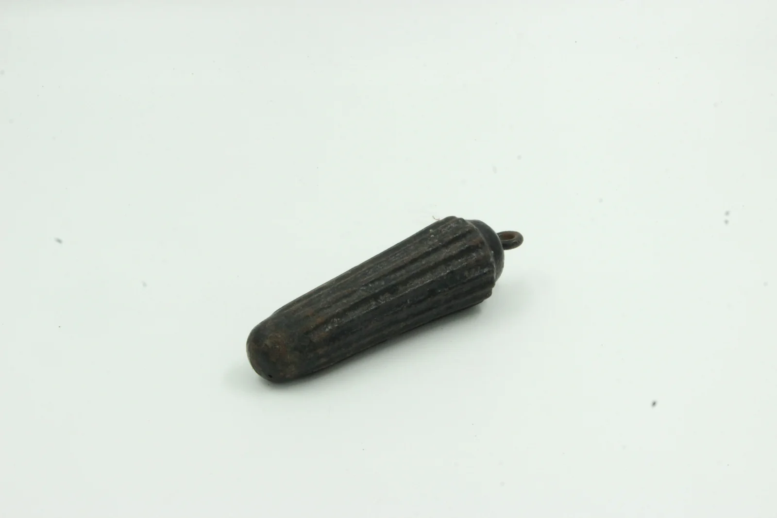 Opis: Telo mu je gusto rebrasto i konusno se sužava. Krajevi su zaobljeni. Deo prstena za kačenje lanca sata je okrugao. Obojen je crnom gvozdenom bojom.