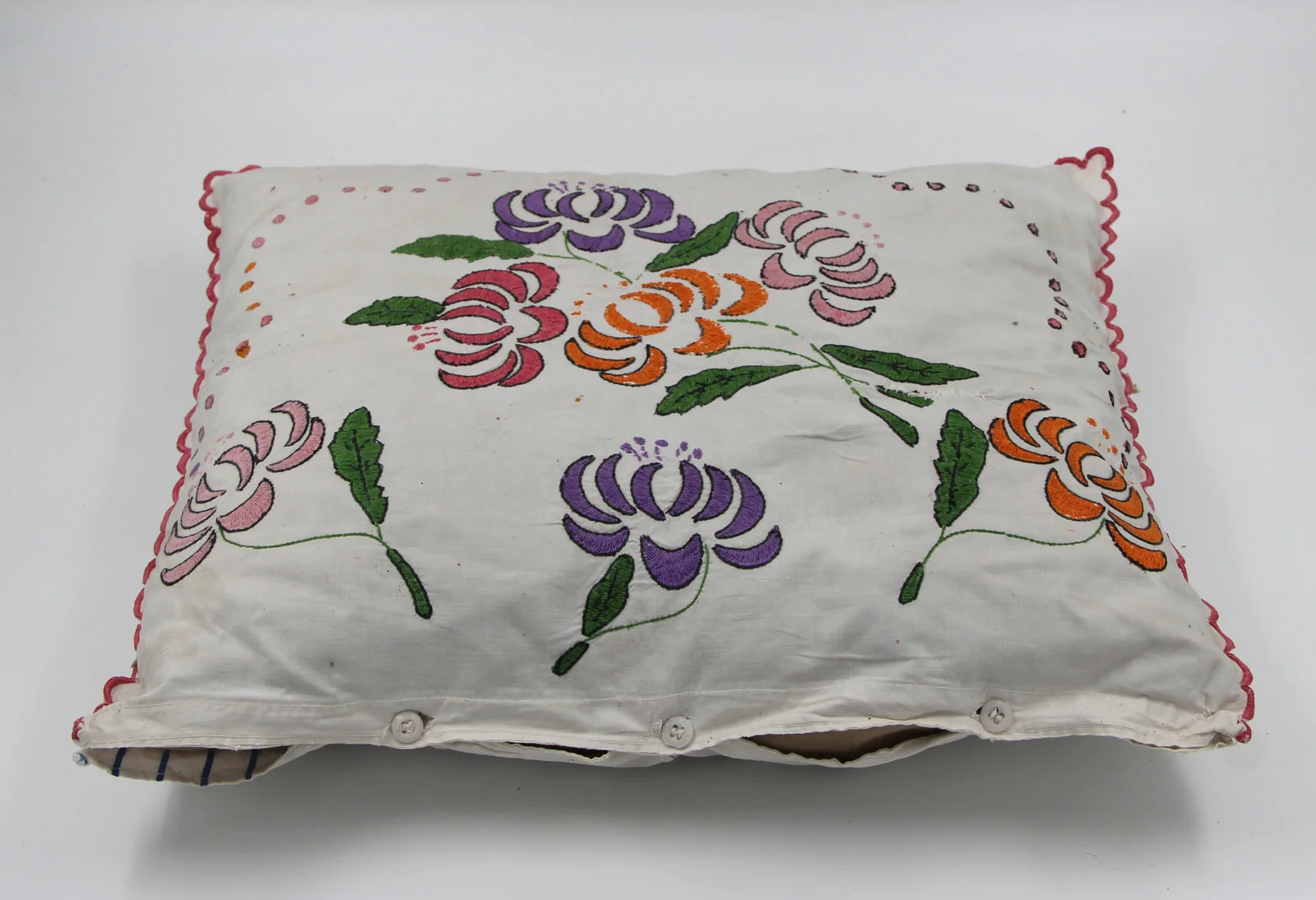 Opis: Buket hrizantema izvezen pamučnim koncem za vez tehnikom „hamislaposöltés“. Boje hrizantema: ljubičasta, ružičasta, narandžasta, sa zelenim listovima. Ciklama cik-cak ivica spaja dva dela jastučnice.
