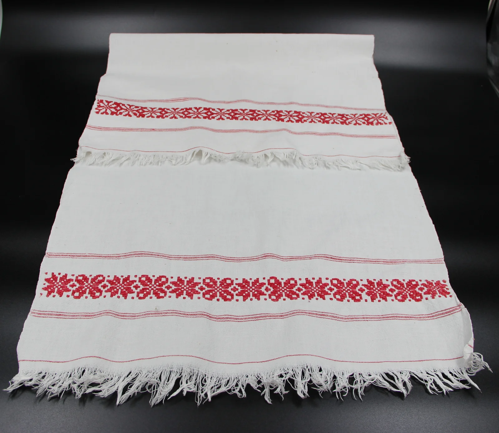 Opis: Ukras je izvezen (naizmenično se smenjuju dva cvetna motiva), dopunjen trostrukim prugama na gornjem i donjem delu.