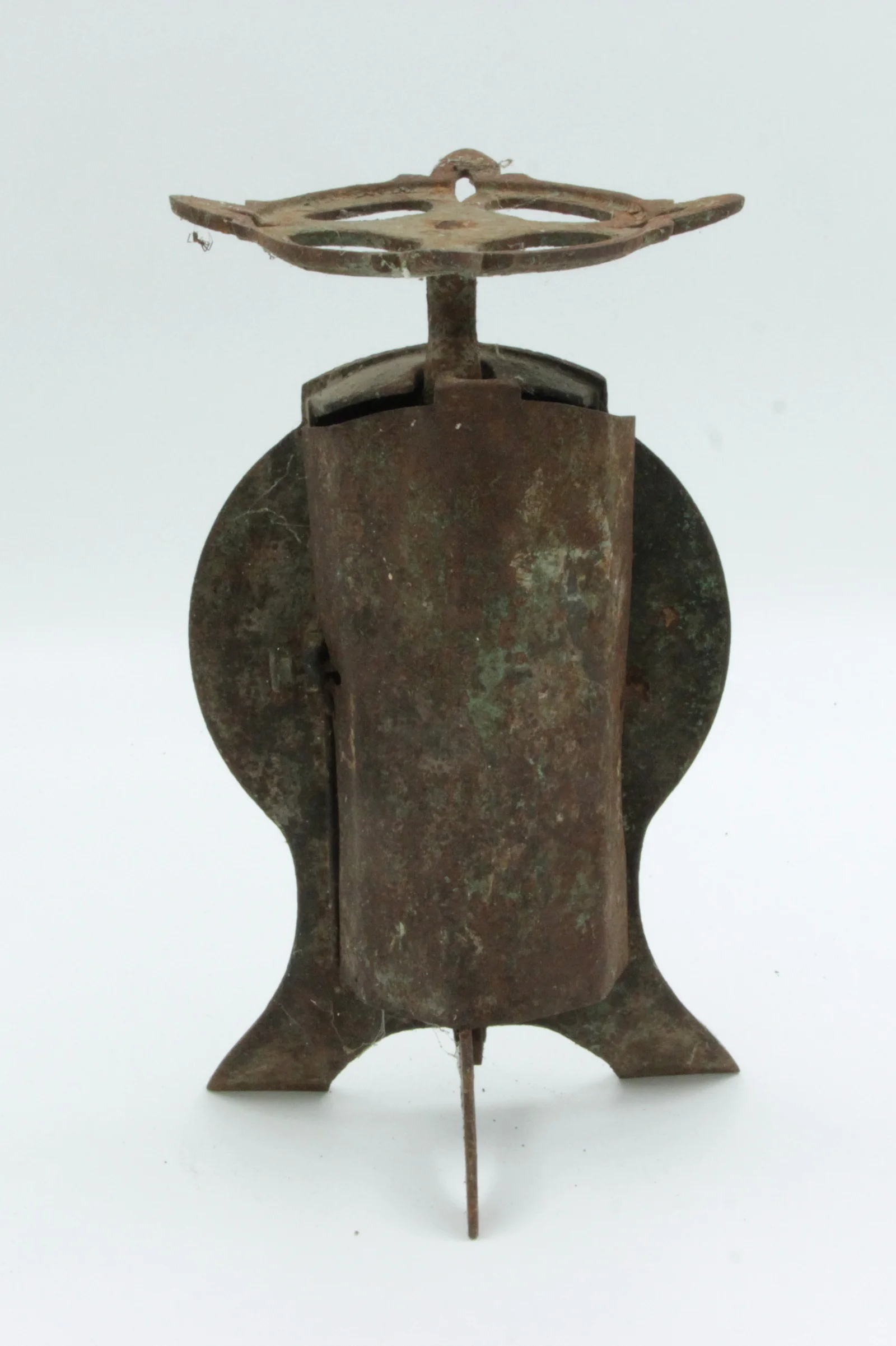 Opis: Nedostaje joj tacna. Ima okrugli brojčanik, koji je zakovan za telo. Trostubna. Na poleđini cilindrično savijena vertikalna ploča štiti mehanizam.