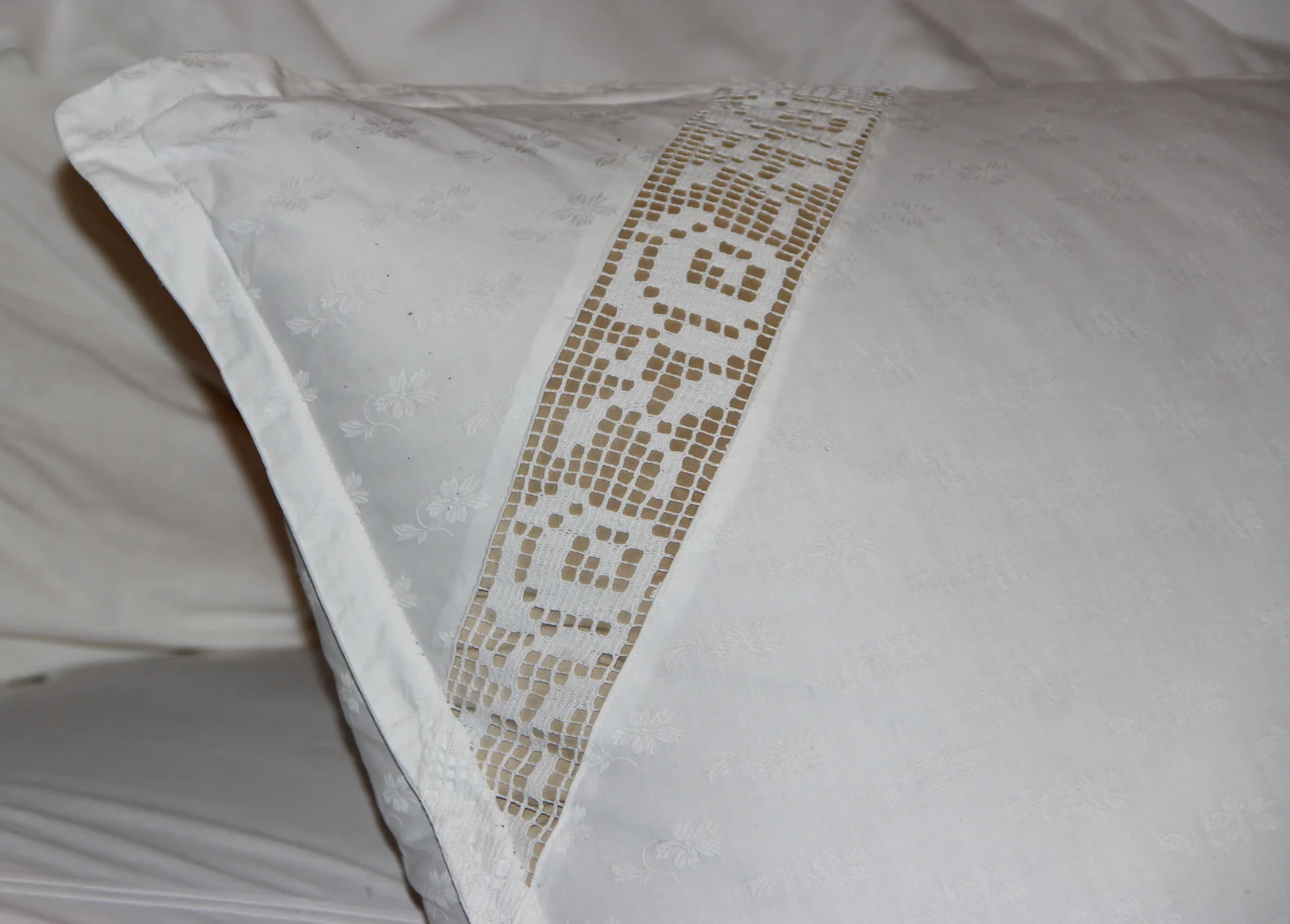 Opis: Ukras je postavljen na licu jastuka. Ukras čine dijagonalno postavljene trake čipke sa motivom ruže, rađene tehnikom heklanja, u gornjim uglovima (desna čipka je oštećena).