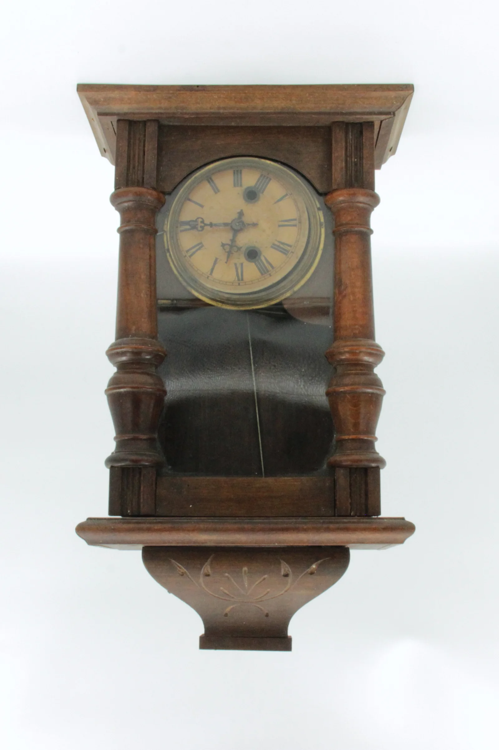 Opis: Mehanizam sata u ukrašenoj drvenoj kutiji sa staklenim vratima. Oba vrata kutije ukrašena su tokarenim stubovima. Kratak klatno sa velikim mesinganim diskom. Okrugli brojčanik, požuteo, možda od kosti, konveksan, sa rimskim brojevima, obrubljen mesinganim prstenom. Brojčanik je pomeren.